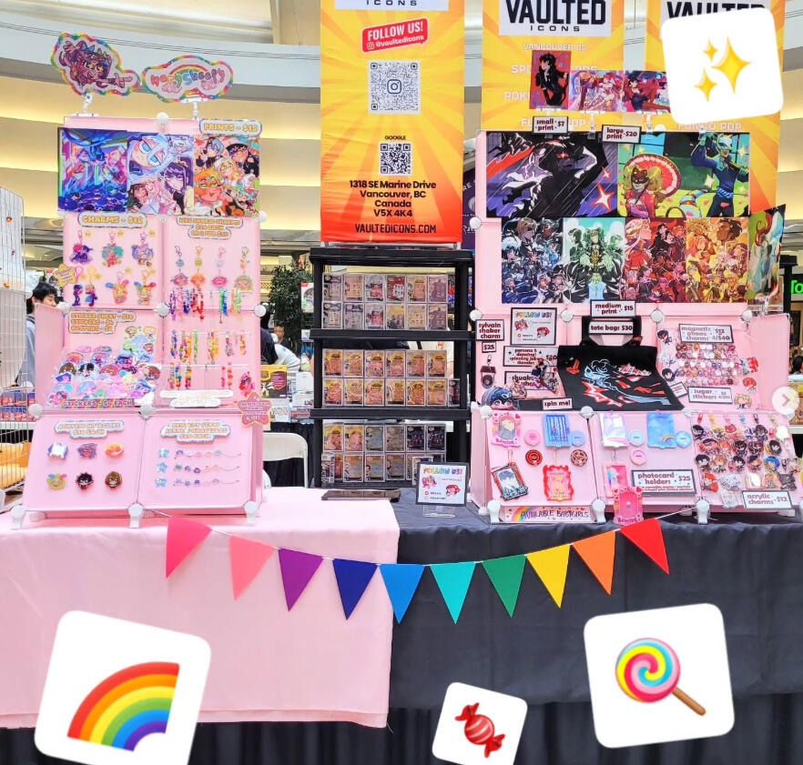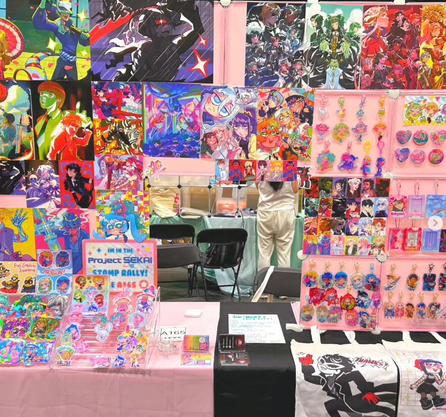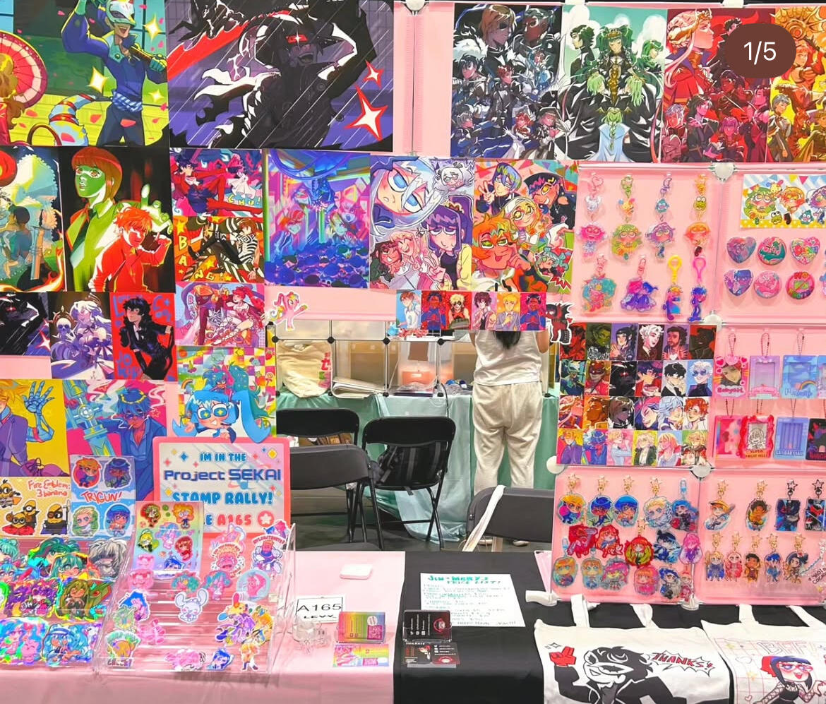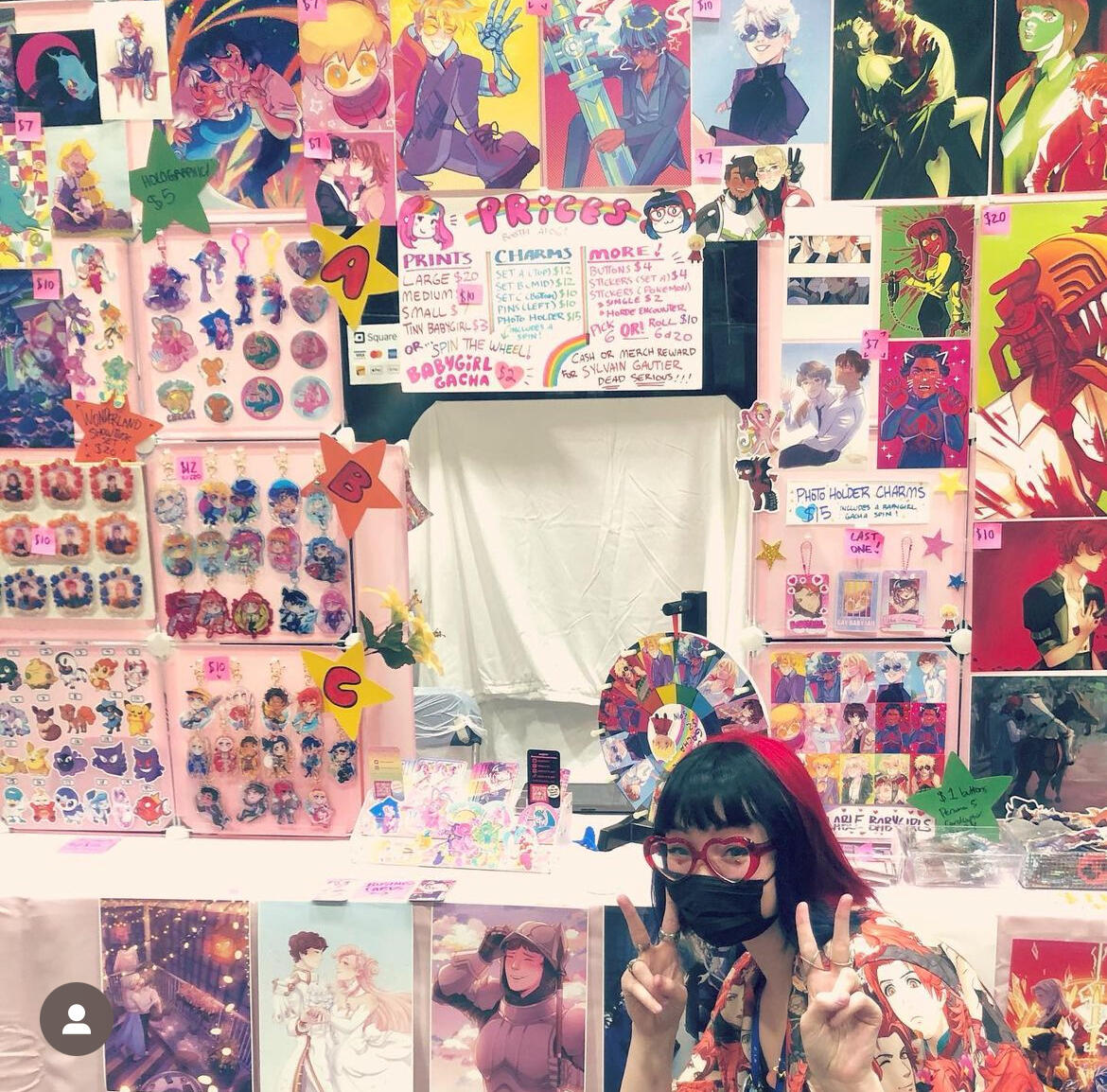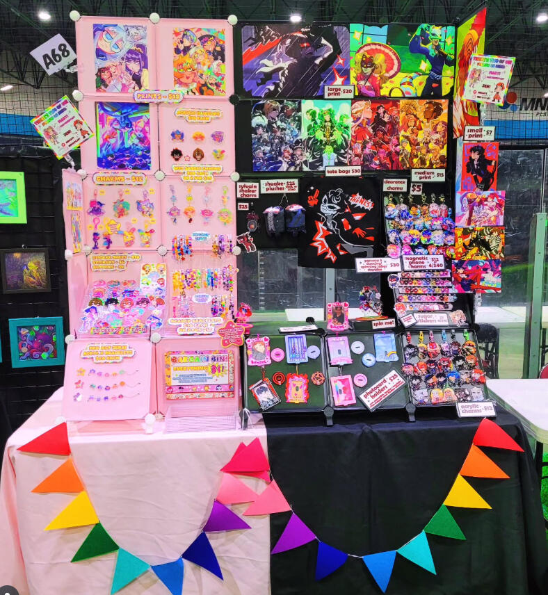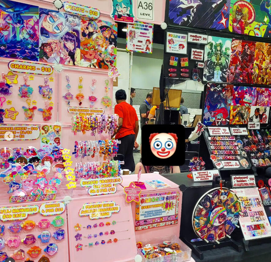 mary has an elusive presence online that contrasts greatly with their extremely colourful appearance and chatterbox personality irl! their art is just as eye-straining and silly! 🩷❤️🧡💛💚🩵💙💜